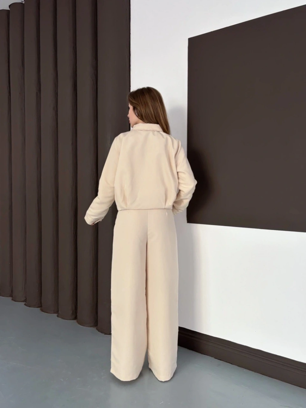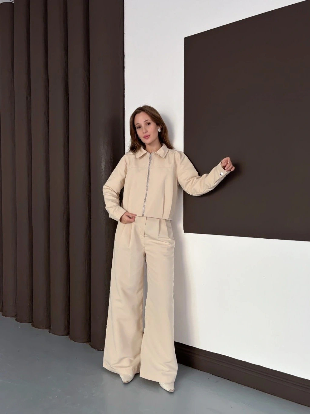 Pantolon yırtmaçlı elbise ikili triko takım vizon elf