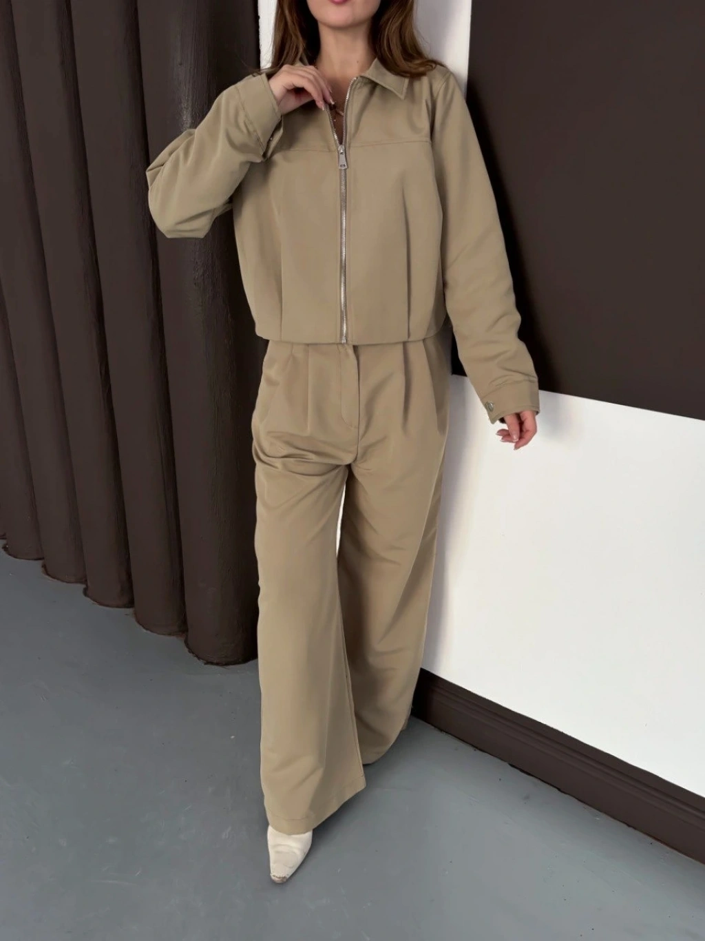 Pantolon yırtmaçlı elbise ikili triko takım vizon elf